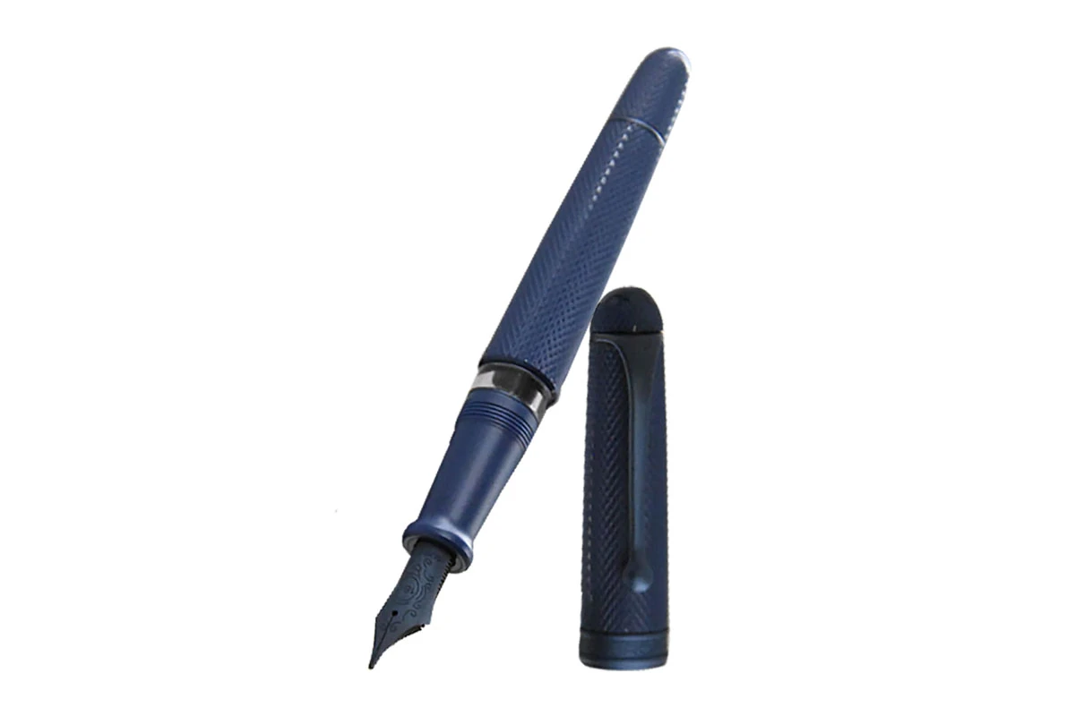 De vulpen is vervaardigd uit blauwe hars met guilloché print en is voorzien van een 18 karaats gouden penpunt. Deze is blauw gekleurd en draagt daarom bij aan de strakke, maar nog altijd klassieke uitstraling. De afwerkingen van de pen zijn van het materiaal ruthenium, wat langdurig gebruik verzekert. De vulpen maakt gebruik van een piston vulsysteem.