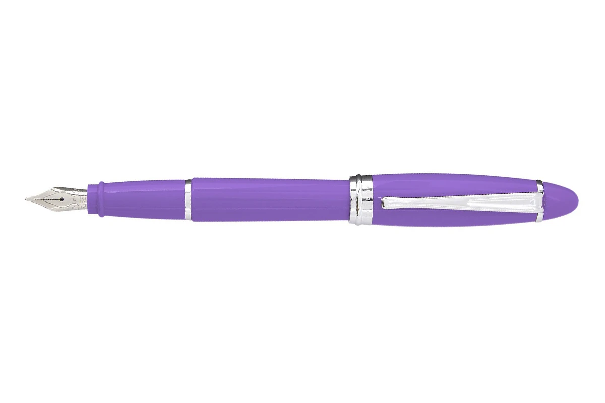 Le stylo plume Aurora Ipsilon a un corps en résine synthétique avec des touches de laque violette et d’argent. Il a une pointe en acier inoxydable disponible en plusieurs tailles.