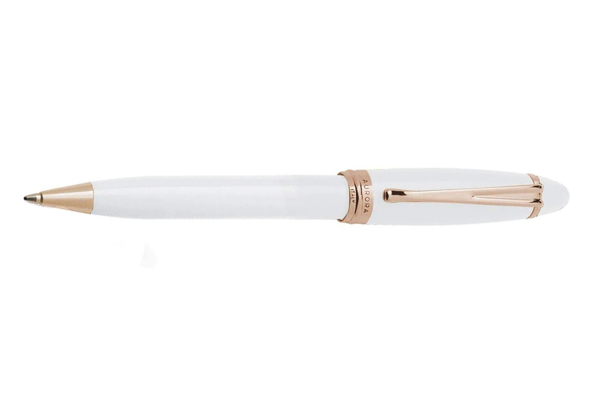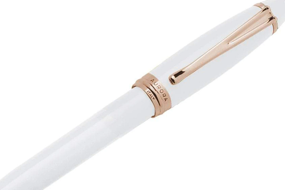 De Aurora Ipsilon balpen heeft een lichaam van hars met witte lak en goudgecoate afwerking.