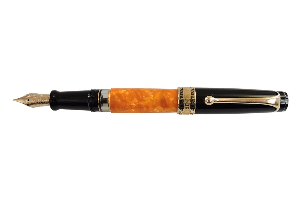 Deze vulpen heeft een oranje lichaam met een gemarmerd effect, gemaakt van het speciale materiaal Auroloide. De dop en onderkant van de pen zijn zwart gelakt, en de pen is afgewerkt met vergulden ringen en clip.