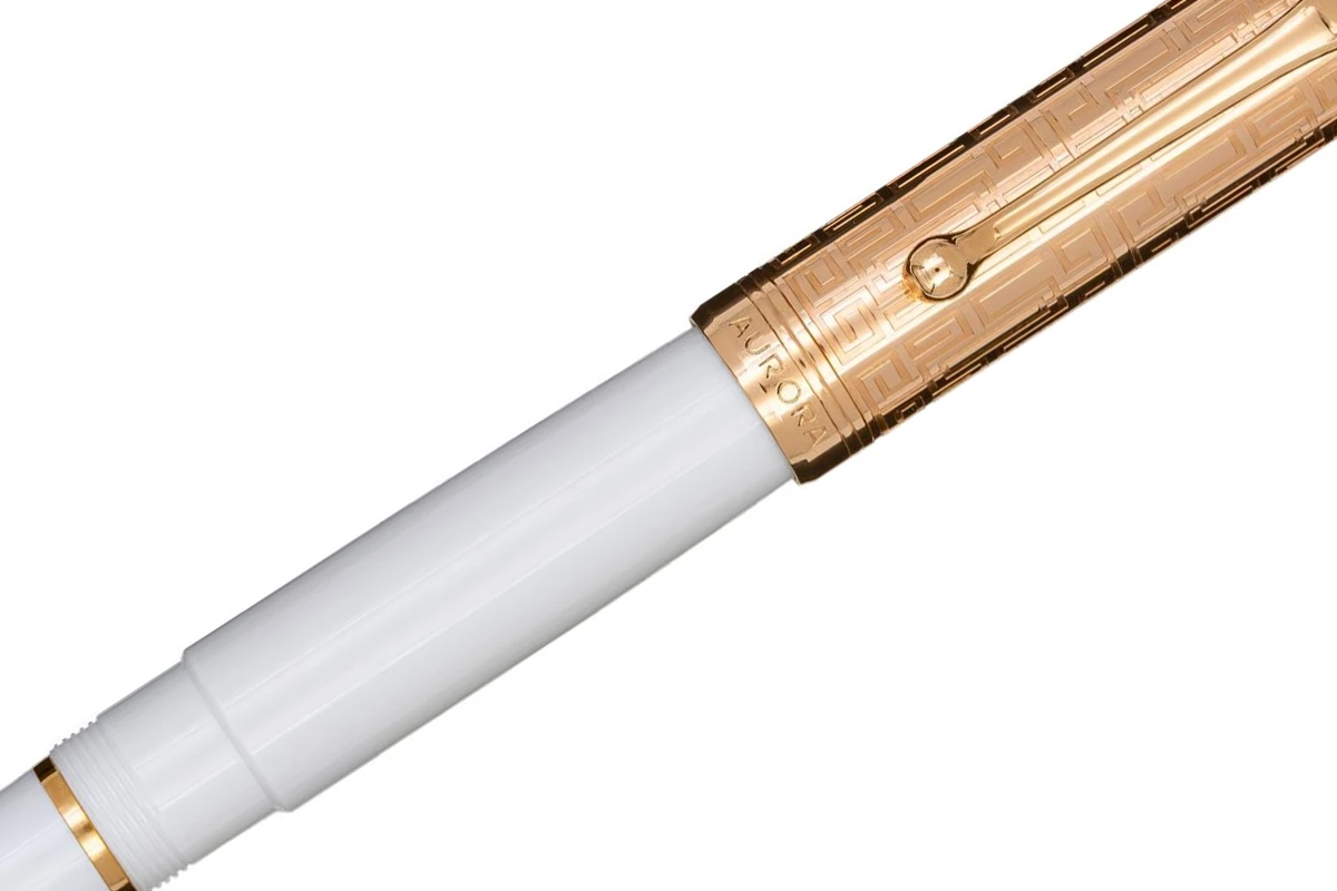 The pen’s body is made of white resin, finished with a rose gold cap and the signature Aurora-style clip.