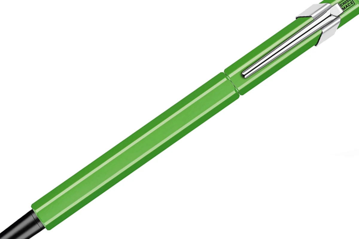 Vier fluokleuren – paars, groen, geel en oranje – geven de grafische lijnen een extra vonk. Het matte marineblauw en zwart versterken het eigentijdse design en de industriële esthetiek van deze schrijfinstrumenten. Het gelakte wit brengt een element van evenwicht in deze verfrissende wervelwind van plezier. Met behoud van een 100% Swiss Made kwaliteit onderstreept de 849 vulpen de gedurfde, creatieve geest van Caran d’Ache.