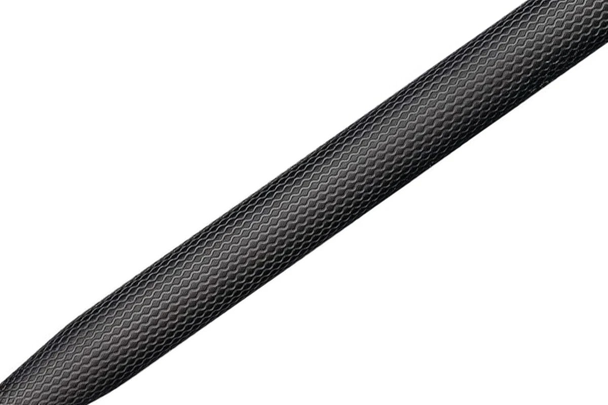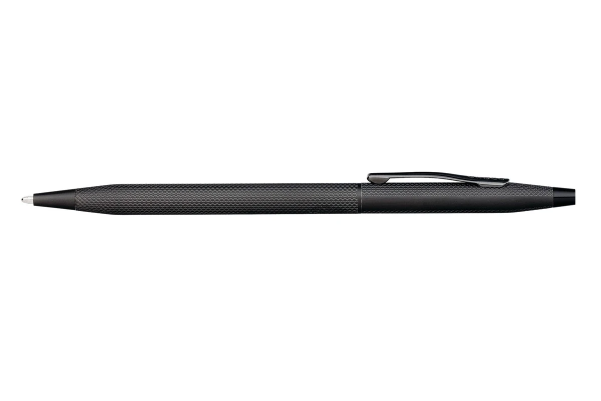 Het zwart geborsteld stalen lichaam van de pen is afgewerkt met een diamant-vormig patroon en zwarte PVD coating.