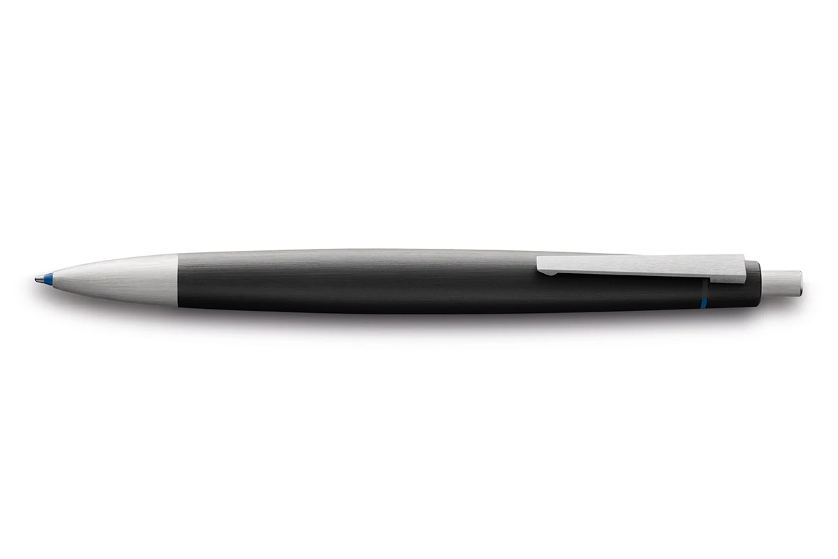 Gemaakt van moderne materialen; roestvrij staal en Makrolon. Een balpen die van welgeteld vier kleuren is voorzien. Uitgerust met balpen vullingen Lamy M 21 in de kleuren zwart, blauw, rood en groen.