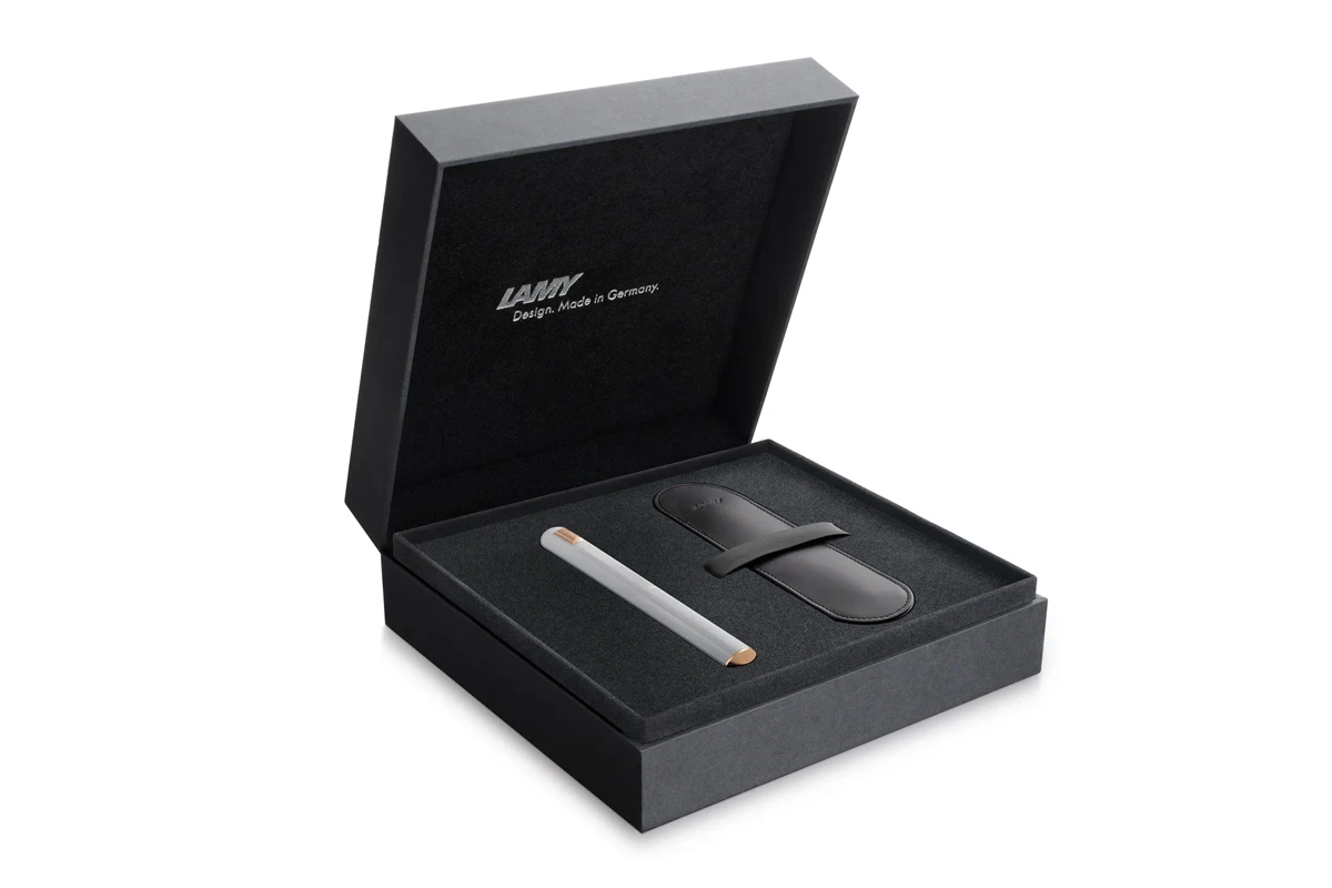 De pen wordt geleverd in een geschenkverpakking met lederen etui, Lamy Z27 converter en blauwe cartridges.