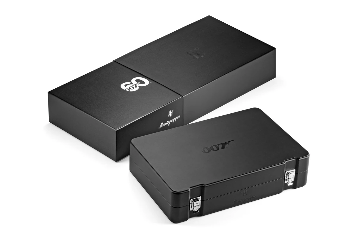 De vulpen wordt ook geleverd met 007 en 60th Anniversary inktflesjes met blauwe en zwarte inkt. Een 8mm, 18K ruthenium gouden penpunt draagt ook het James Bond 60th Anniversary logo.