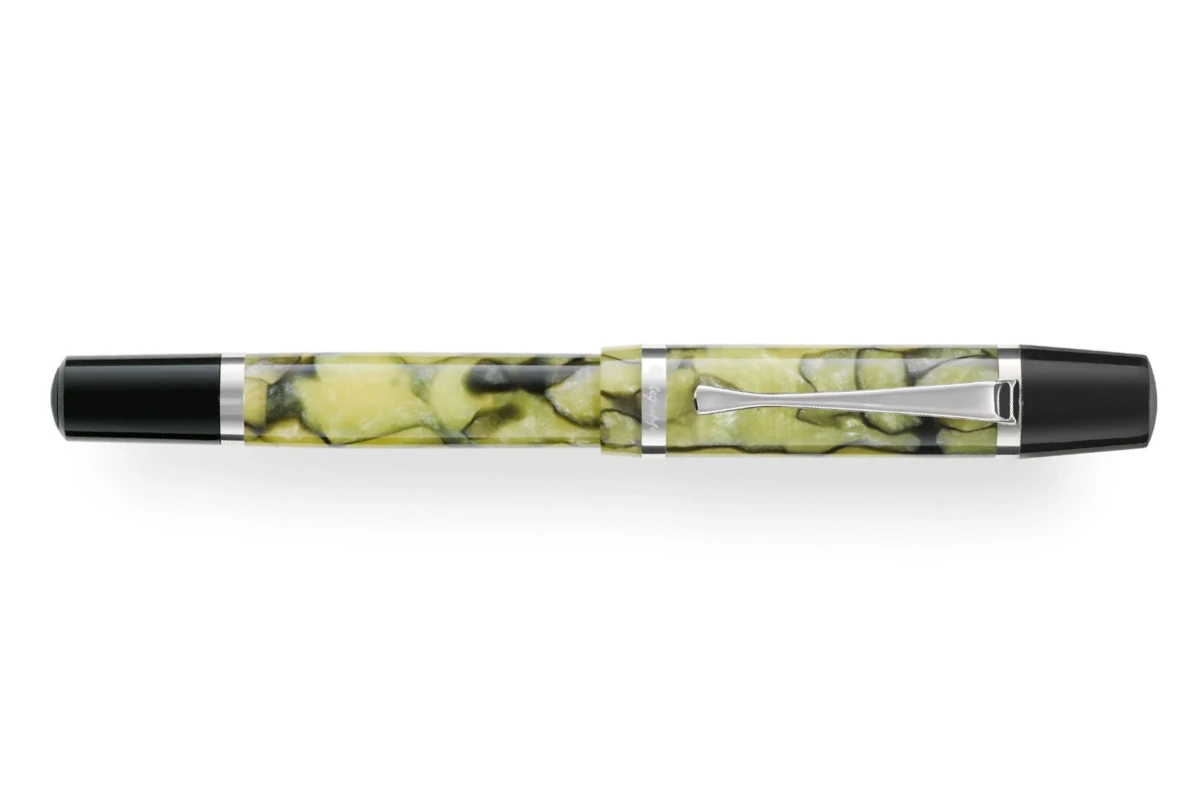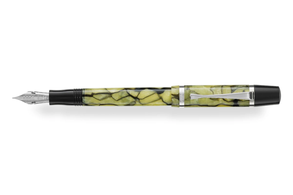 De Montegrappa Nazionale is dus weer terug, en deze pen, uitgevoerd in groen gemarmerd celluloid, heeft een gelimiteerde oplage van slechts 100 stuks van zowel Extra Fine en Fine penpunten. Deze penpunten zijn bijzonder flexibel. Met deze flexnibs kan zowel dun als dik geschreven worden, en dit resulteert in verschillende handschriften en kalligrafische effecten. Het grootste voordeel is dat dit allen met slechts één penpunt mogelijk is. Door iets harder met de pen op het papier te drukken, resulteert dit in een breder schrift. De penpunt is vervaardigd uit 14 karaats goud.