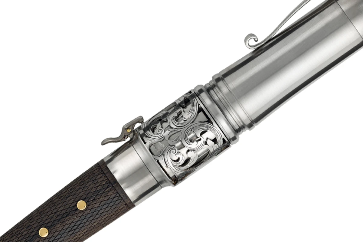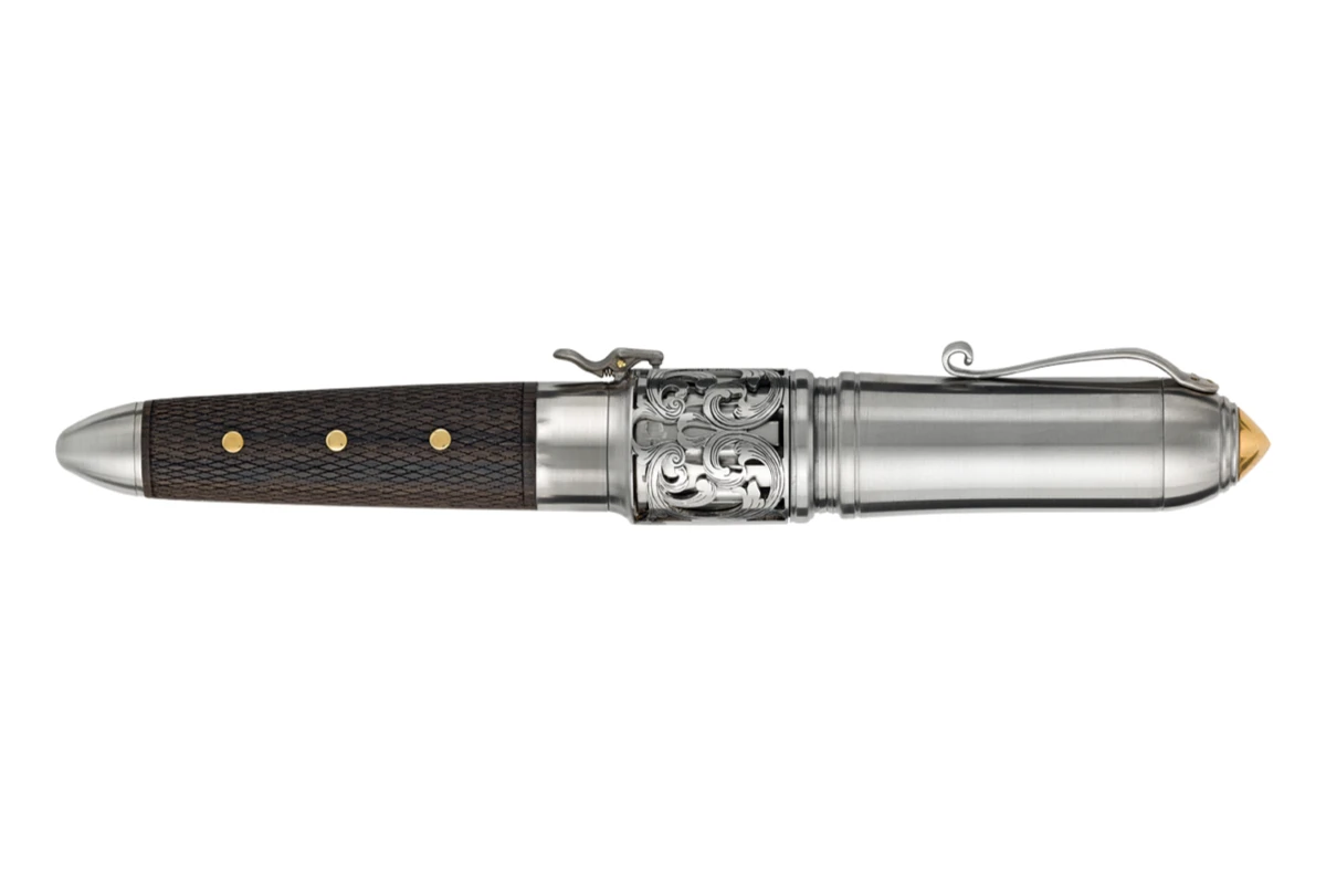 Revolver is de nieuwste Limited Edition van Montegrappa. Dit is exemplaar 68 uit een oplage van slechts 300 stuks wereldwijd. Het volumineuze lichaam van de pen is vervaardigd van geborsteld roestvrij staal. Voor het handvat is hout van een 4200 jaar oude moeras-eik gebruikt, wat het oppervlak een donkere, aardse uitstraling geeft. In dit oppervlak zijn ronde, vergulde details van messing aangebracht, die aan kogeltjes doen denken.
