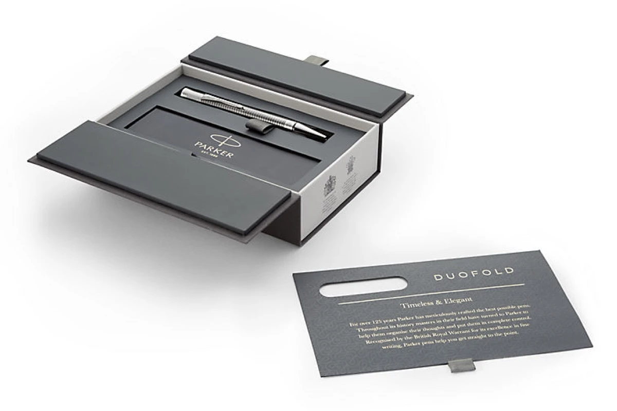 Wordt verpakt in een luxieuze Parker cadeaudoos.