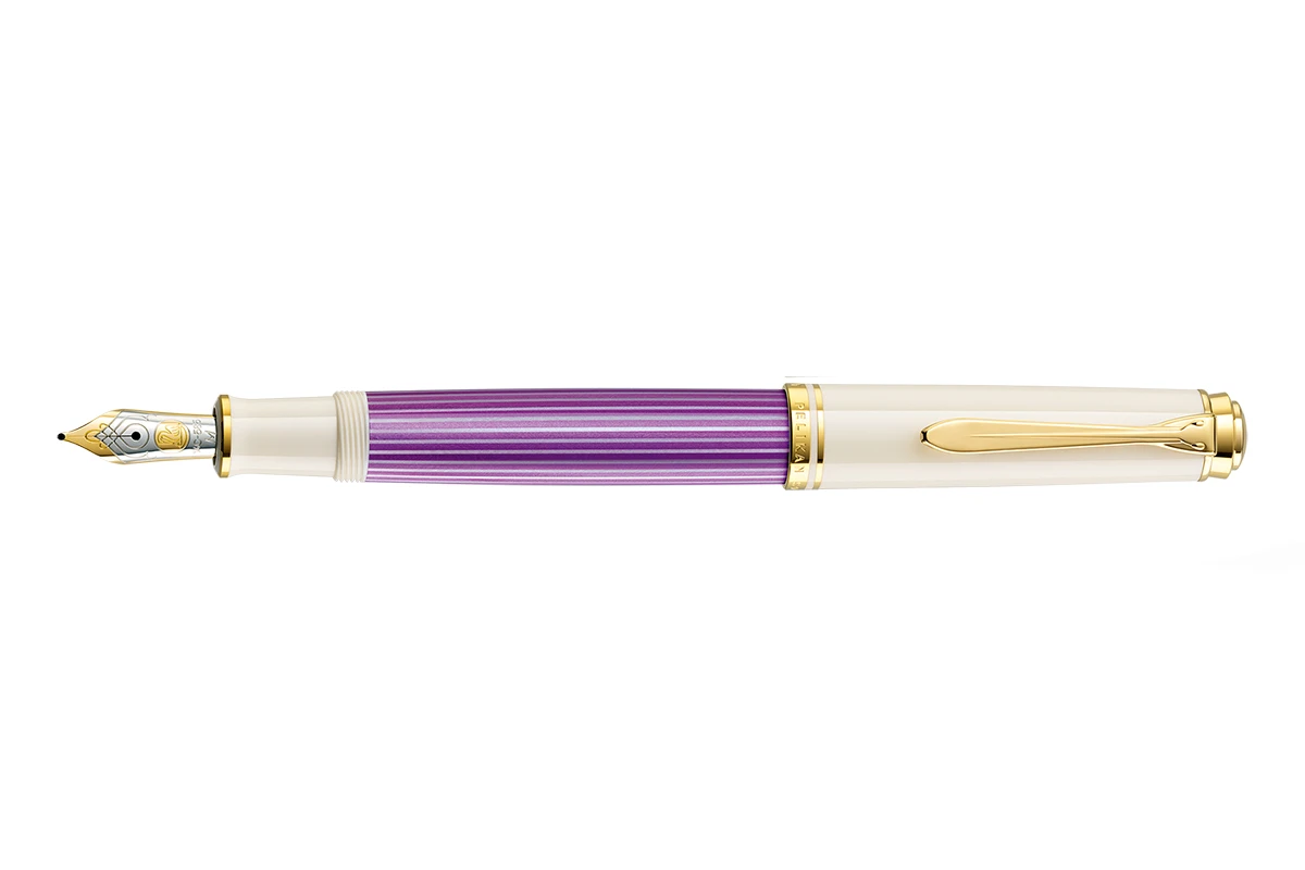 De witte delen van de pen zijn gemaakt van hoogwaardig hars dat eerst is gedraaid en daarna gepolijst tot een hoge glans. De barrel met de witte en paarse strepen is gemaakt van celluloseacetaat dat zeer zorgvuldig is vervaardigd en tot een huls is gedraaid. Alle ringen en de kenmerkende Pelikan clip zijn verguld met 24 karaats goud. De vulpen met zuigermechanisme heeft een 14 karaat bi-color gouden penpunt met rhodium afwerking en is verkrijgbaar in 4 penpuntbreedtes: EF, F, M en B. De bijpassende balpen heeft een draaimechanisme.