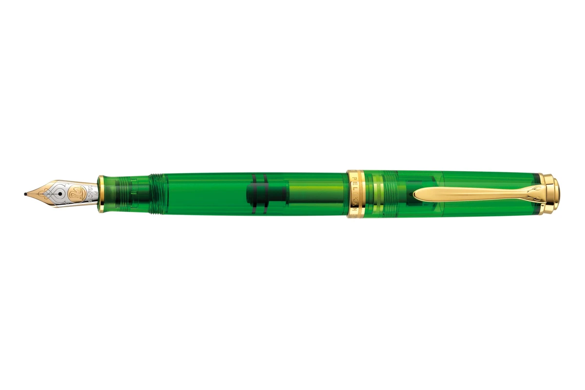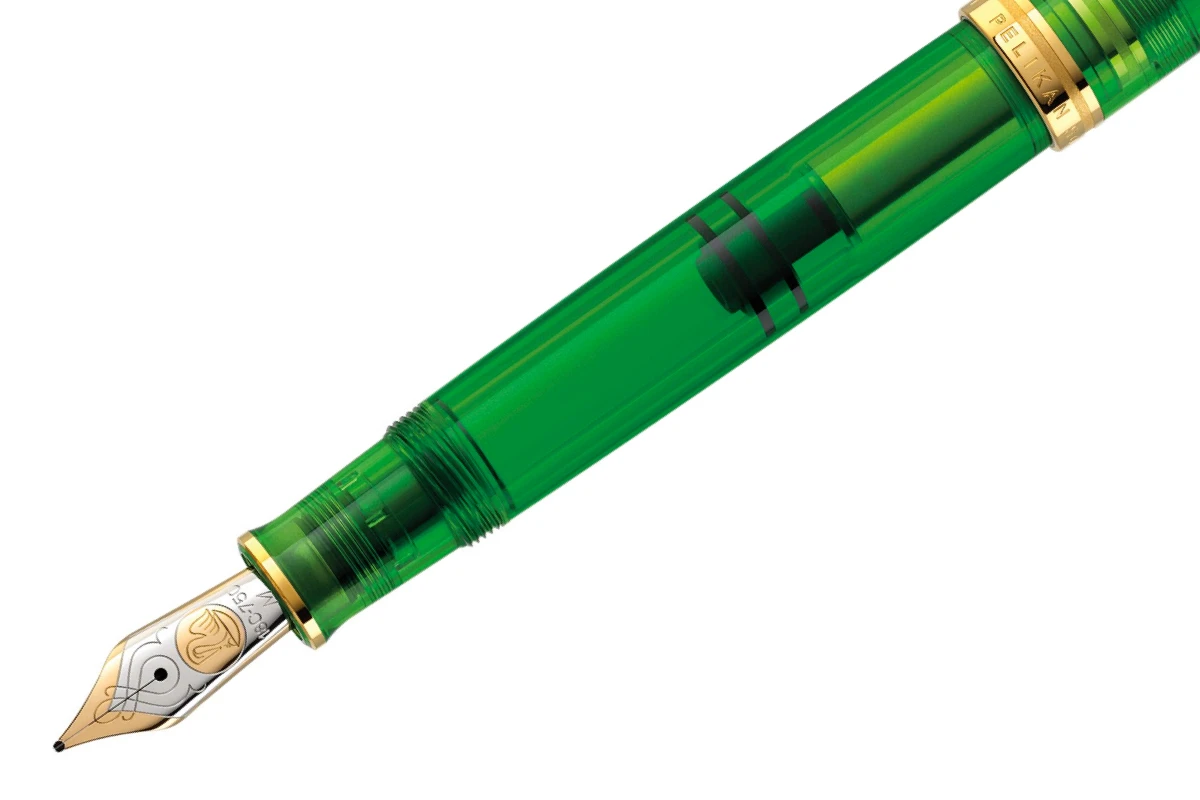 Zoals gebruikelijk zijn de vulpennen van deze Souverän M800 reeks gemaakt met hoogwaardige componenten. De ringen en de traditionele snavelvormige clip zijn vervaardigd uit 24-karaats goud en de 18-karaats bi-color gouden penpunt is met rhodium afgewerkt. De groen-transparante onderdelen geven zicht op het inktniveau en het zuigermechanisme. Deze Souverän-serie is uitsluitend verkrijgbaar als vulpen, in penpunt breedte EF, F, M of B.