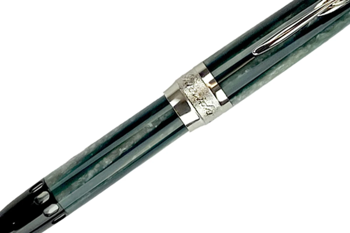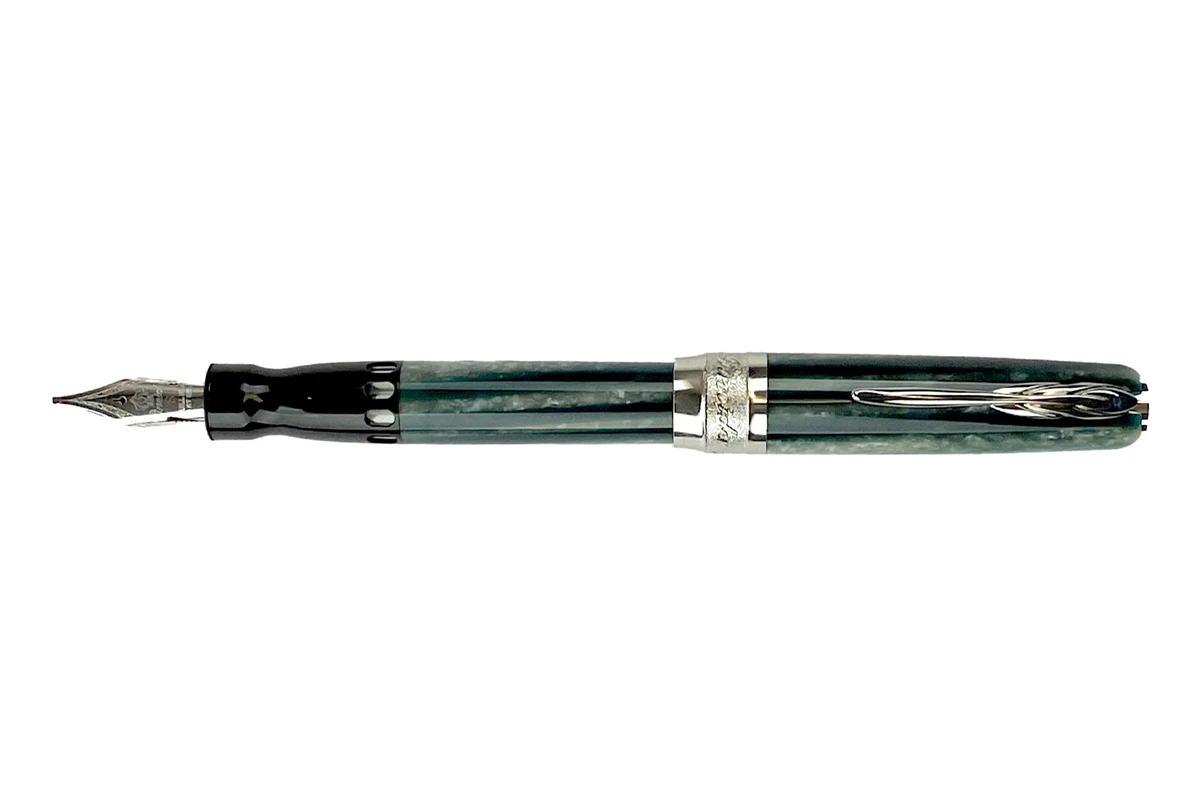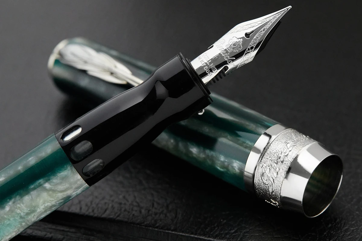 De pen is voorzien van een 14 karaats penpunt en wordt geleverd in een donkergroene pennendoos, met inktreservoir en pipet om de pen mee te vullen.